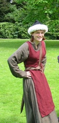 De muts had ik al eerder een keer gemaakt, en is van zwart suede met namaak bont langs de rand. Viking staat tussen haakjes, omdat een en ander niet echt historisch correct is, zoals het gebruik van geverfde linnen, wat pas goed geverft kon worden met modernere kleurstoffen, en een twee handig zwaard, iets dat ze destijds nog niet hadden. |